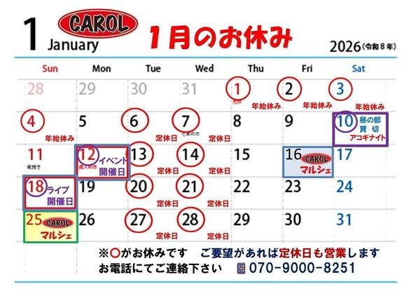 2026年1月の営業カレンダーです! 諸事情で臨時休業等もございますのでお電話にて営業日をご確認ください <m(__)m>