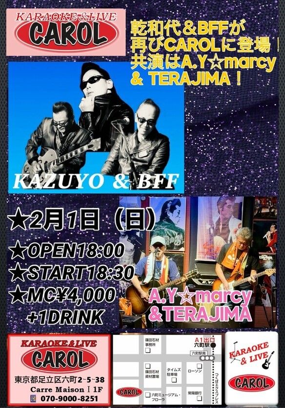 CAROLからのお知らせ! 2月1日(日)に乾 和代&BFFとA.Y☆marcy&TERAJIMAライブを開催します! 前回の乾 和代レコ発ライブから、再び和代が当店CAROLに登場❣ ♪Twist No.1も絶好調 !(^^)! 今回も乾 和代WORLD全開でお届けします! (^^)/ 共演のA.Y☆marcy&TERAJIMAの2人もバッチリ魅せてくれます (*^^)v お席には限りがございますのでお早目のご予約をお願い致します <m(__)m>