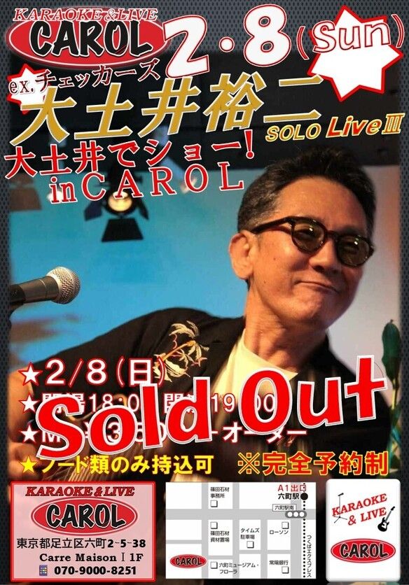 CAROLからのお知らせ! 昨年10月に続き、当店CAROLに元チェッカーズのベース担当・大土井裕二が再び登場! (*^^)v CAROLの永ちゃんに憧れベースを始めた大土井裕二! 今回もアコギとベースギターでのソロライブとなります (^^)/ 最高のライブになること間違いなし! ※既にSOLD OUTの為、キャンセル待ちの対応となります <m(__)m>