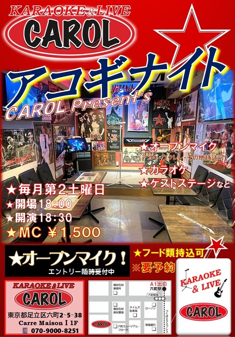 当店CAROL Presentsの「アコギナイト」(オープンマイク)を毎月第二土曜日に開催しています! (*^^)v