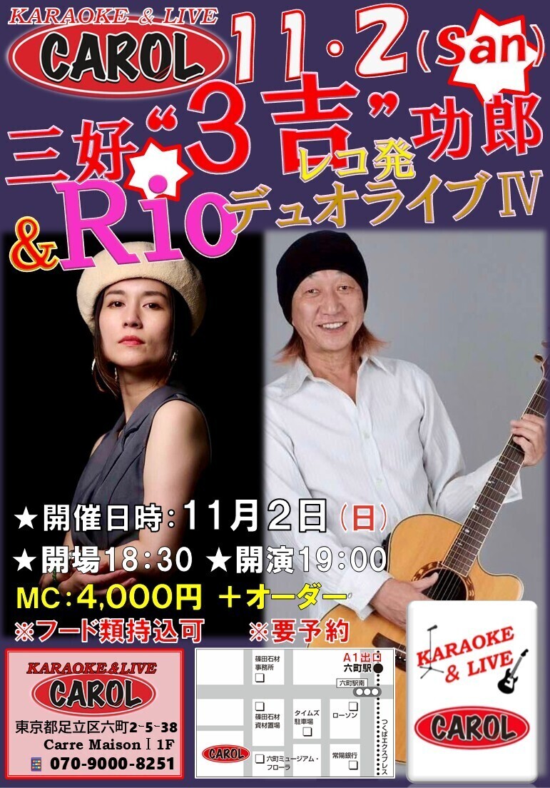間近で3吉さんのギターとRioさんのヴォーカルをお楽しみ下さい!