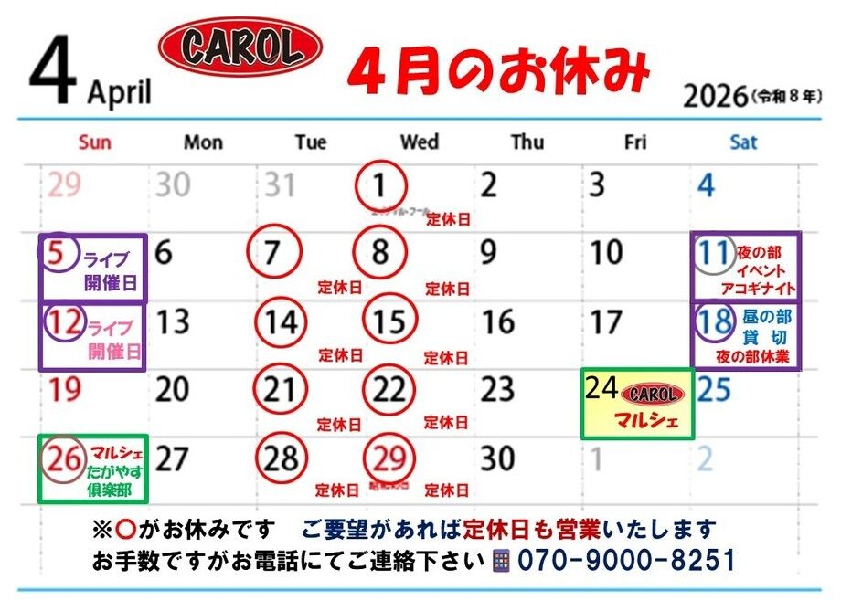 2026年4月の営業カレンダーです! 諸事情で臨時休業等もございますのでお電話にて営業日をご確認ください <m(__)m>