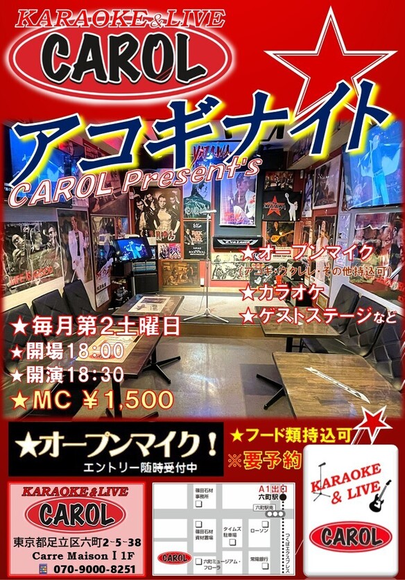 CAROLからのお知らせ! 当店CAROL Presentsの「アコギナイト」(オープンマイク)を毎月第二土曜日に開催しています! (*^^)v 内容は、★お客様参加のオープンマイク(弾き語り)、★ゲストのステージ、★オープンマイク参加者のワンステージ、★オーディエンスを含むミニカラオケ大会などです! 第二土曜日の夜を音楽で楽しみましょう! 只今、絶賛参加者(オープンマイク・オーディエンス)を受け付け中です‼ よろしくお願い致します。 <m(__)m>